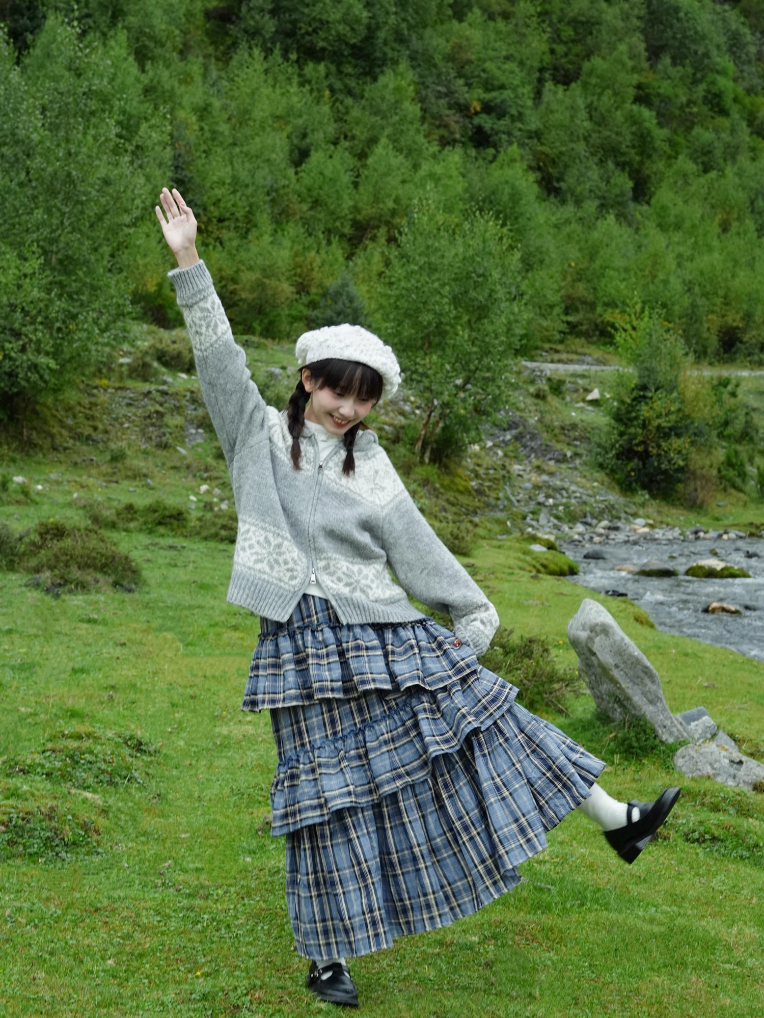 Autumn Winter Brushed Retro Check Tiered Skirt X3406