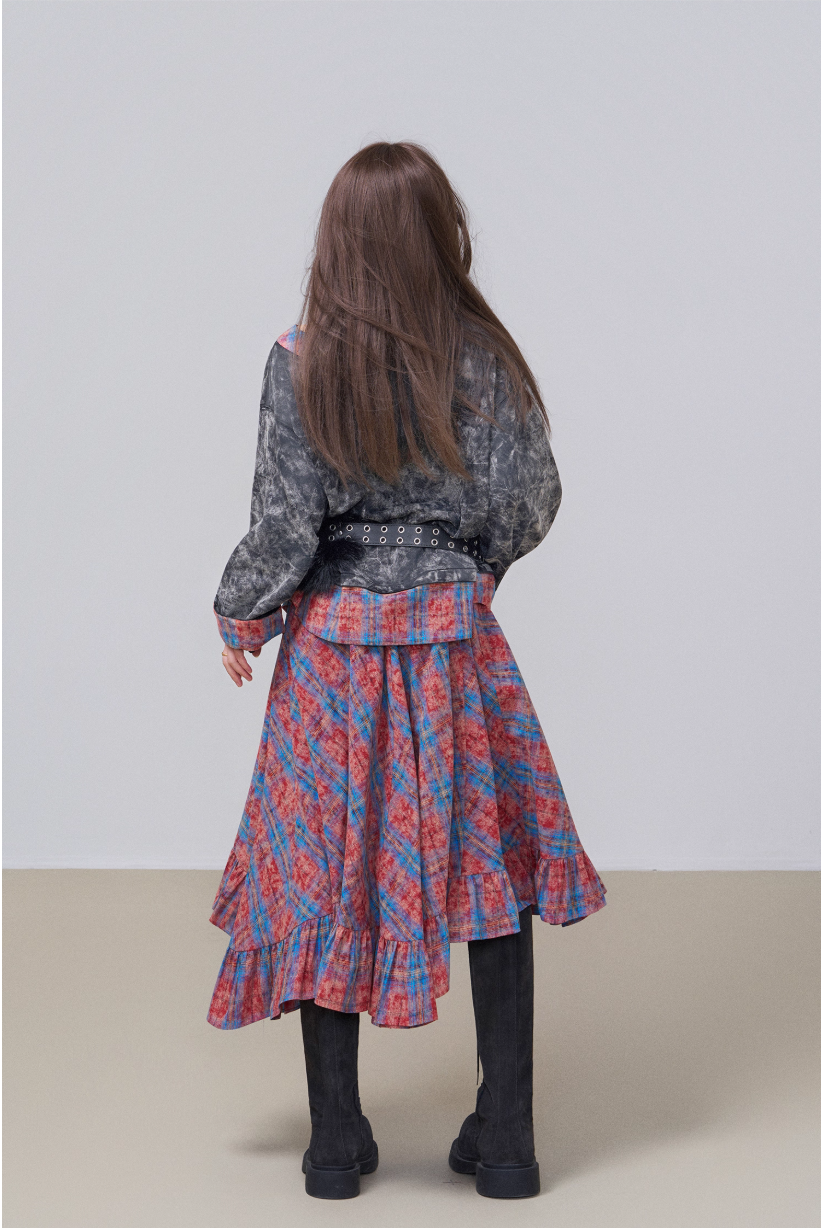 A design that combines a top with a washed texture and a vibrant check pattern.