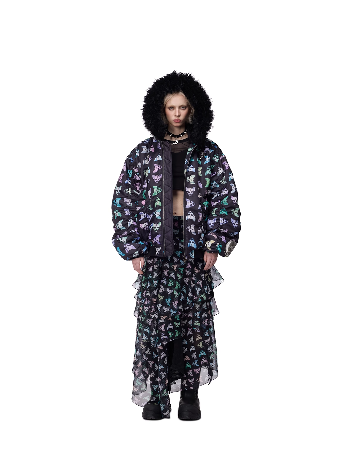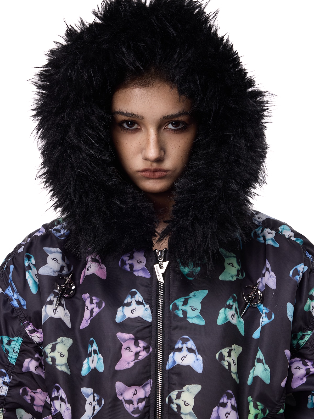 Cat Motif Print Black Metal Faux-Fur Collar Padded Jacket (Unisex) X3488