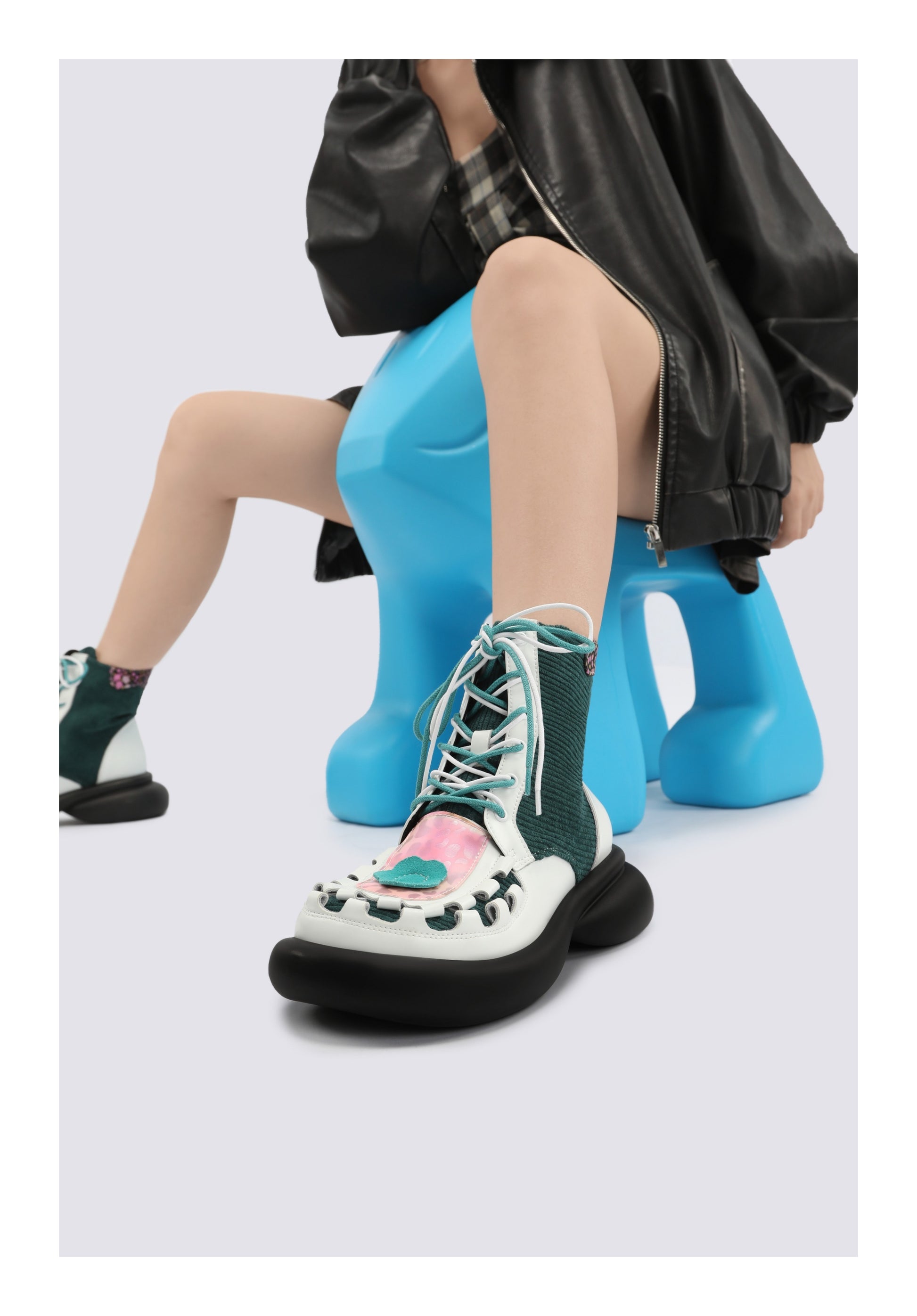 Colorblock Chunky Platform Lace-Up Mid Boots X3483