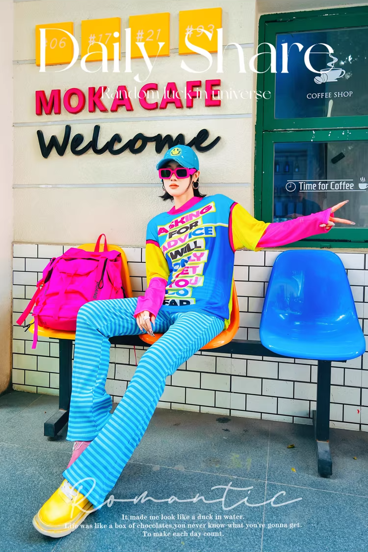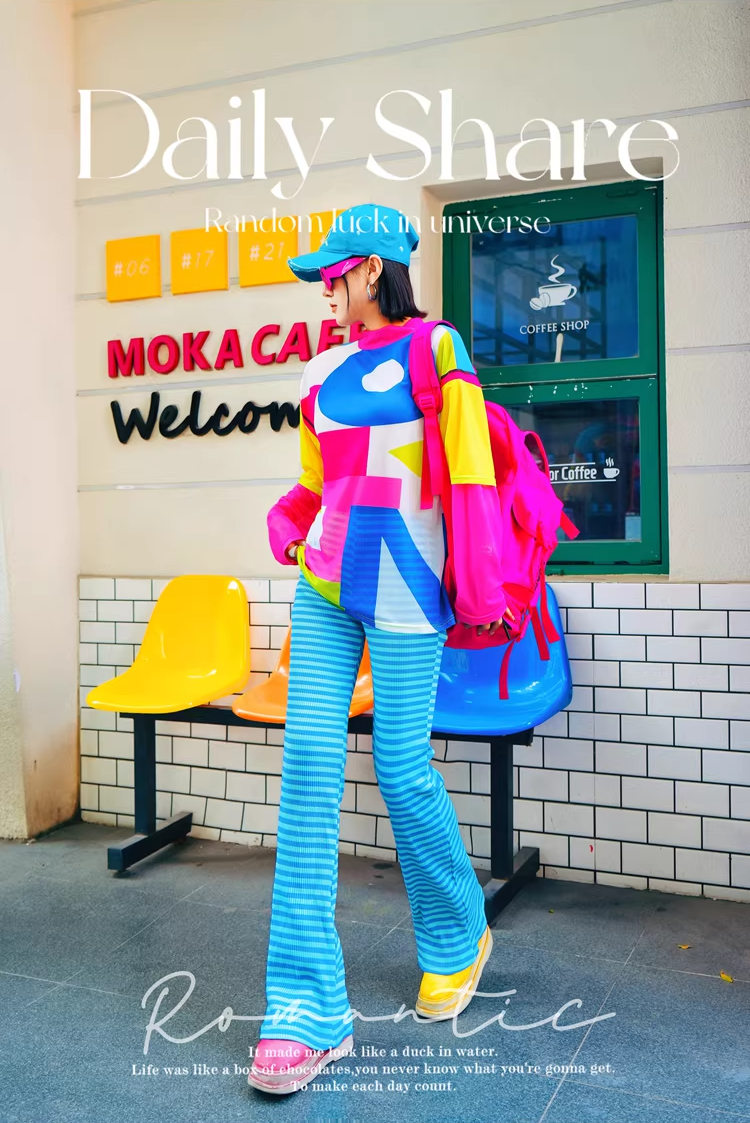 鮮やかなドーパミンカラーが印象的なストライプ柄ストレートパンツ。