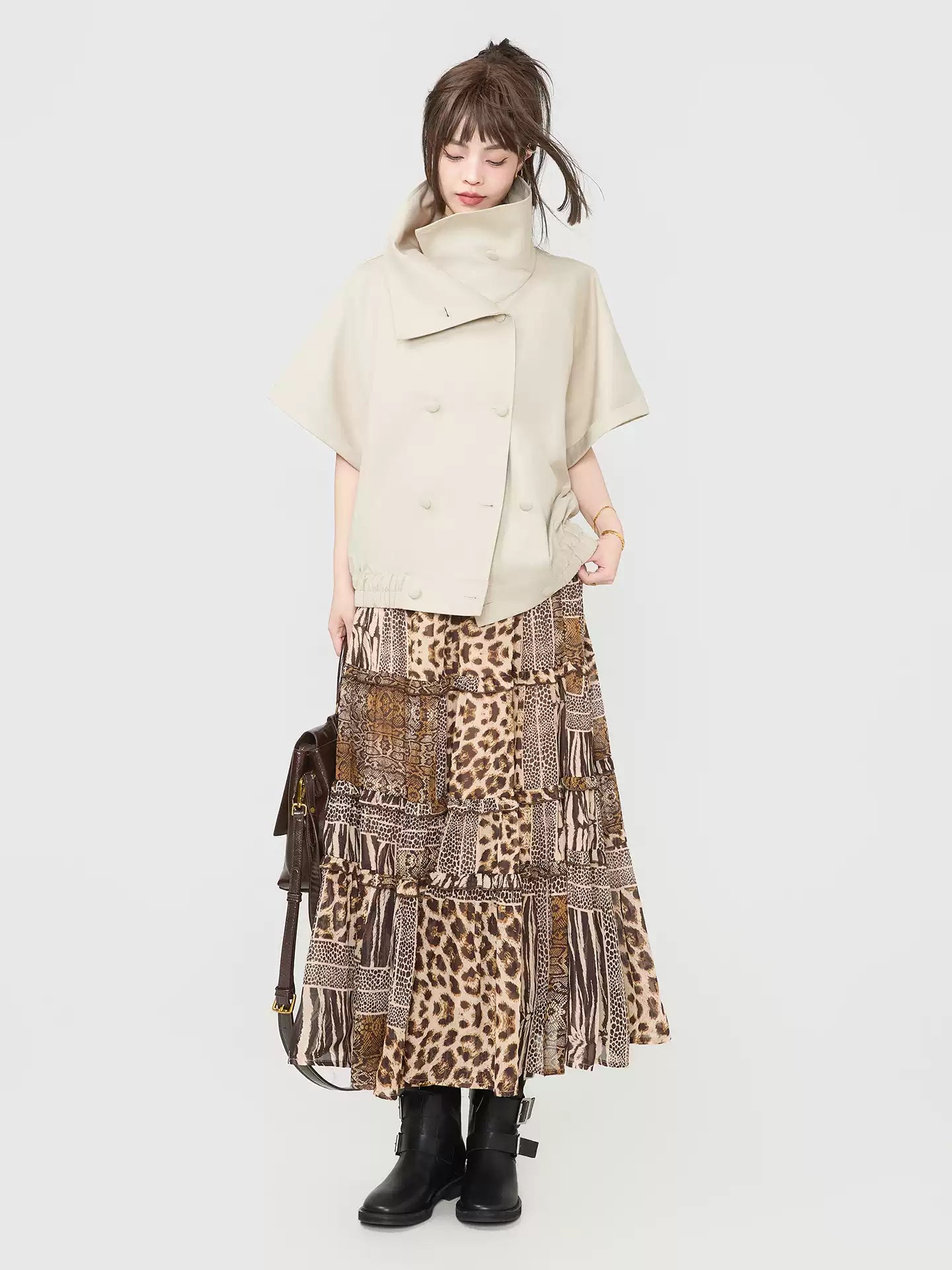 ゆったりとしたシルエットながら、ウエストの切り替えでメリハリのあるスタイルに。