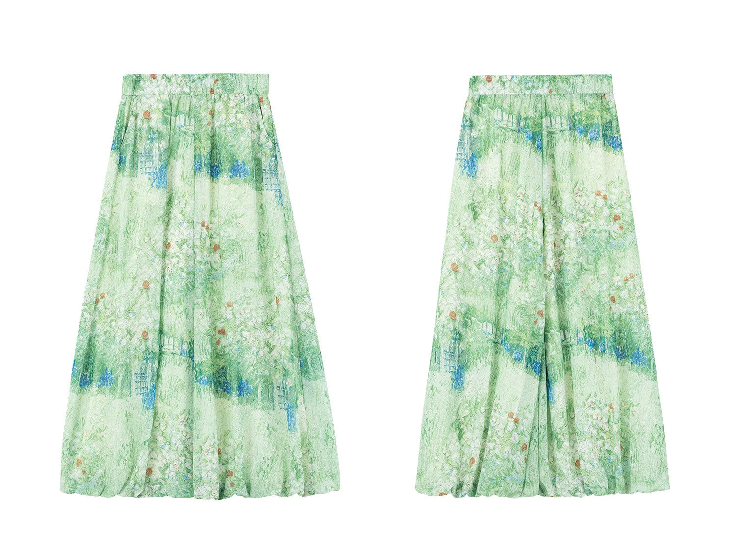 まるで油絵の世界に迷い込んだような、幻想的な花柄プリントのワイドパンツ。