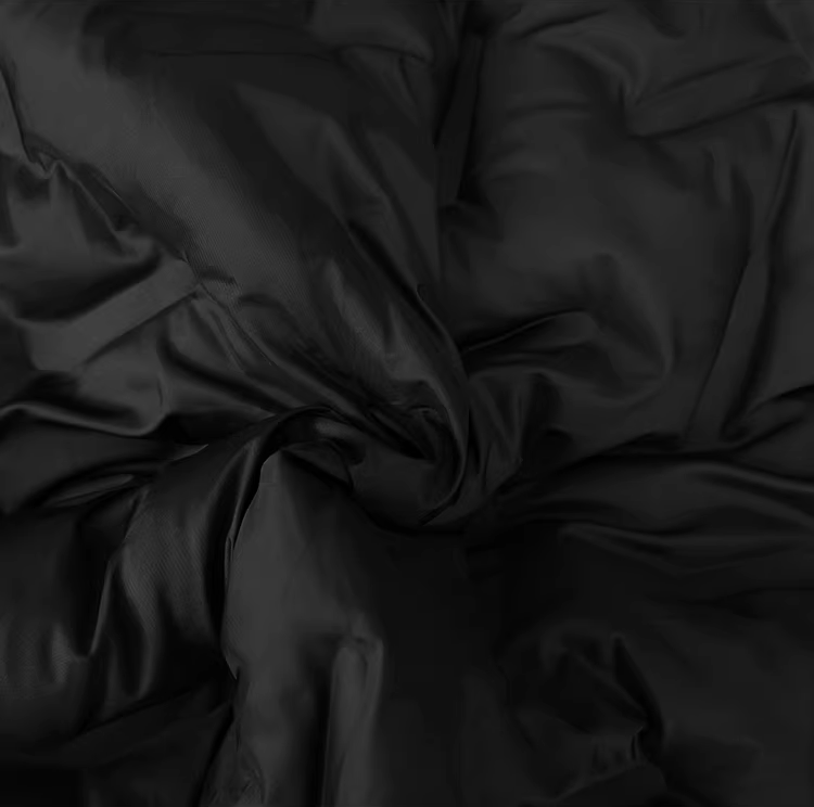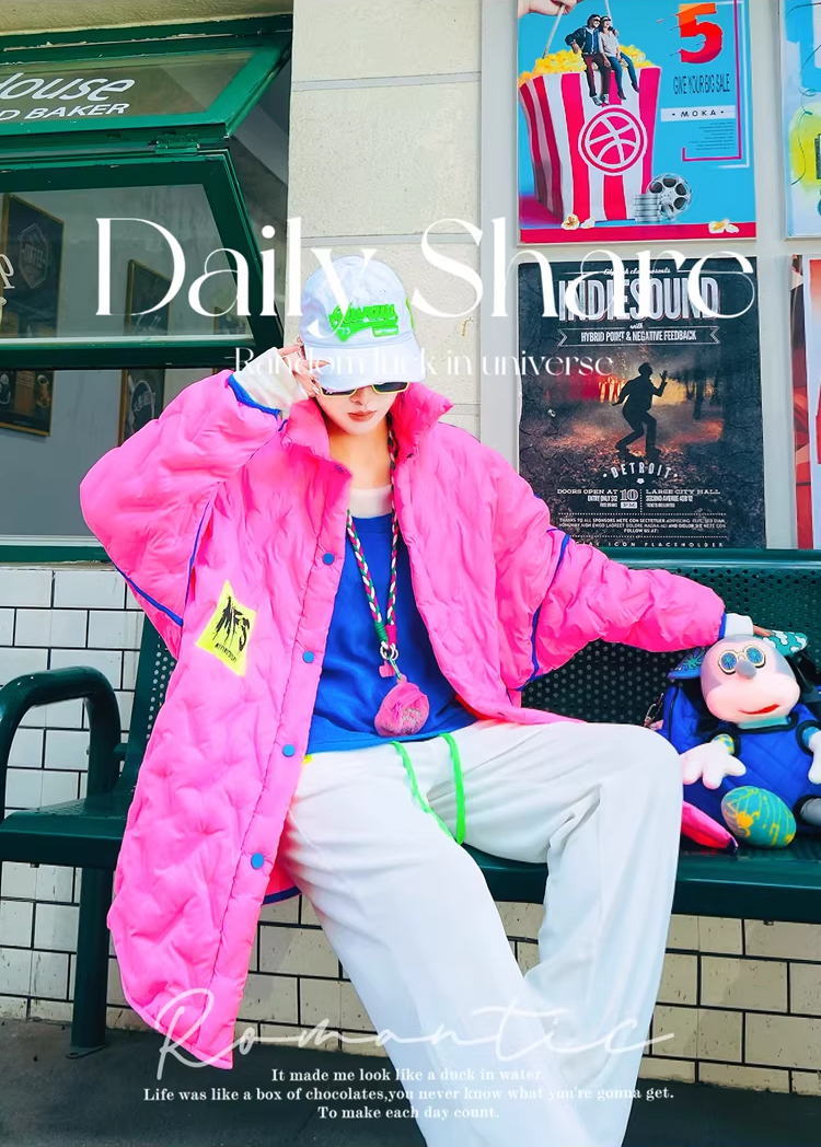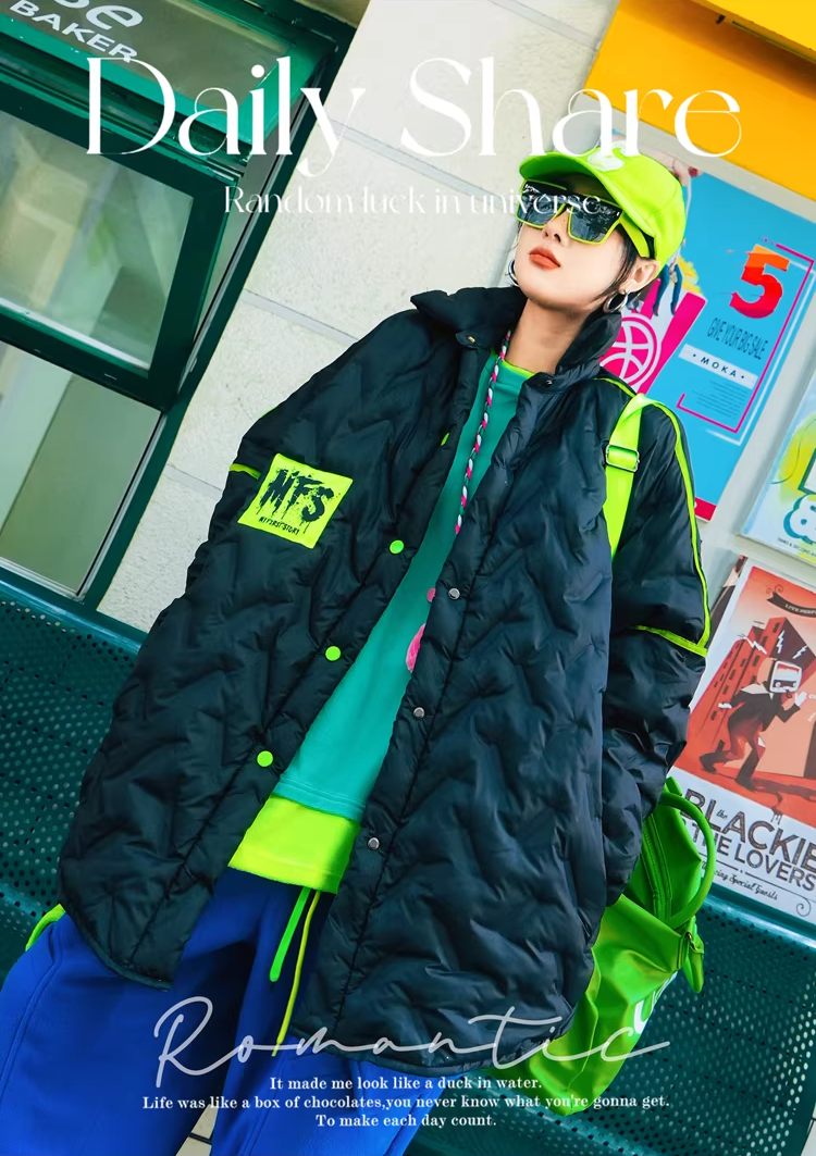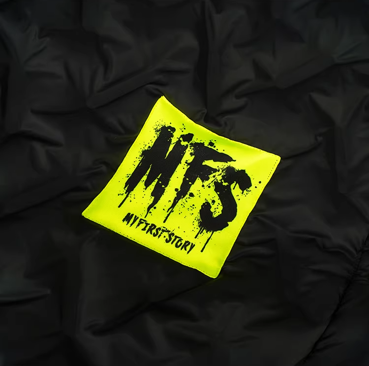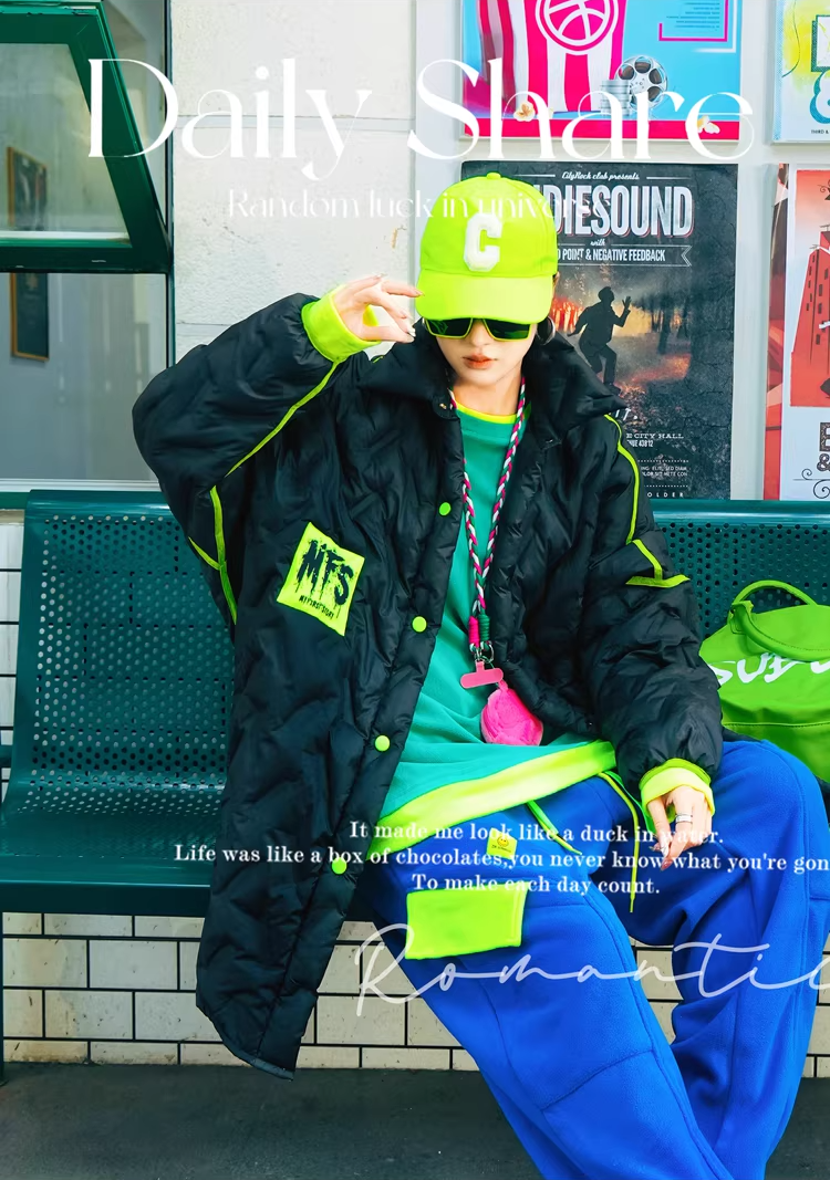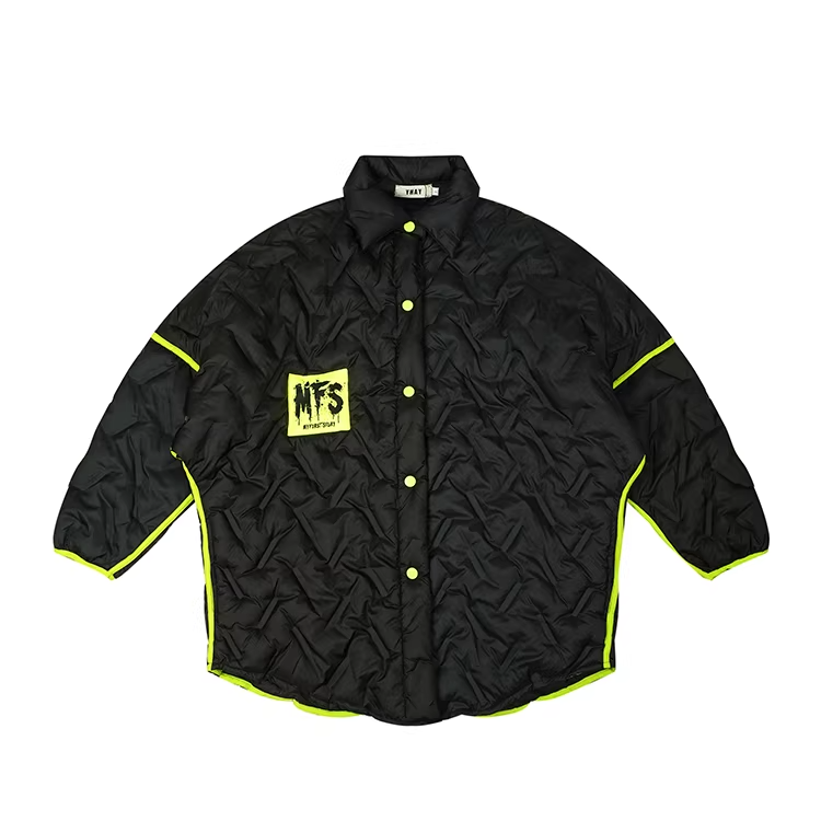 ブラックベースにカラーレターワッペンを施した、存在感のあるオーバーサイズ中綿コート。