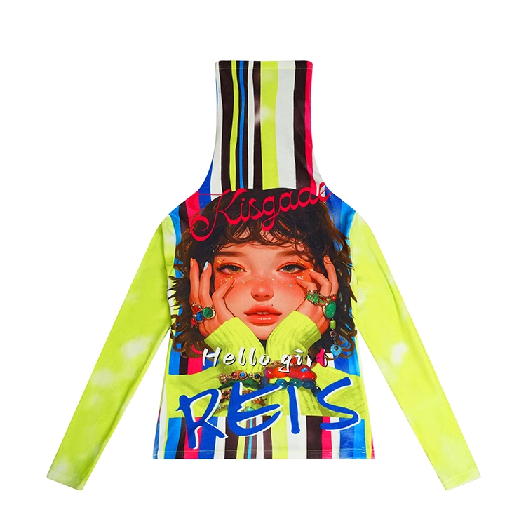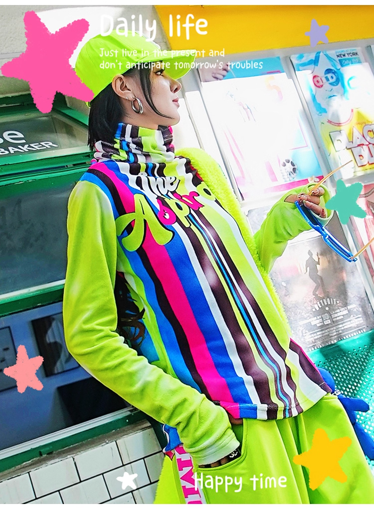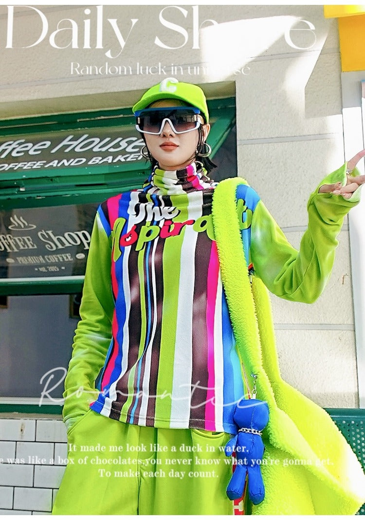 一款引人注目的高領T卹,結合了螢光條紋和品牌標誌。